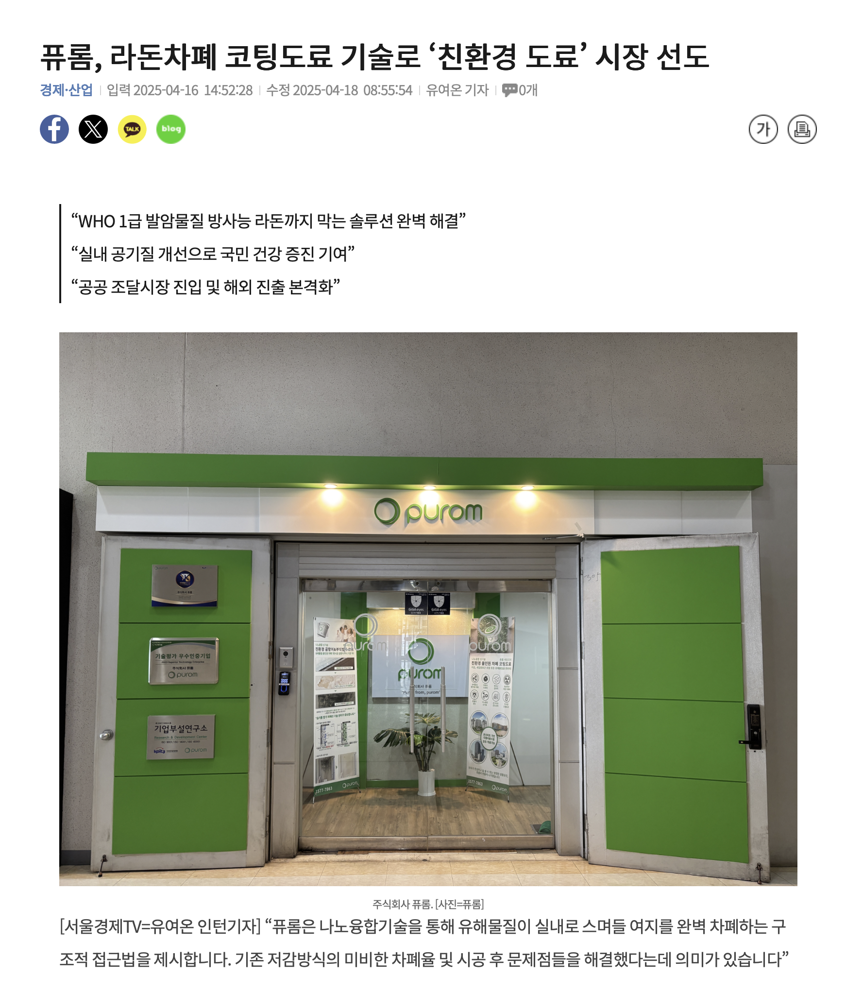 퓨롬, 라돈차폐 코팅도료 기술로 ‘친환경 도료’ 시장 선도
