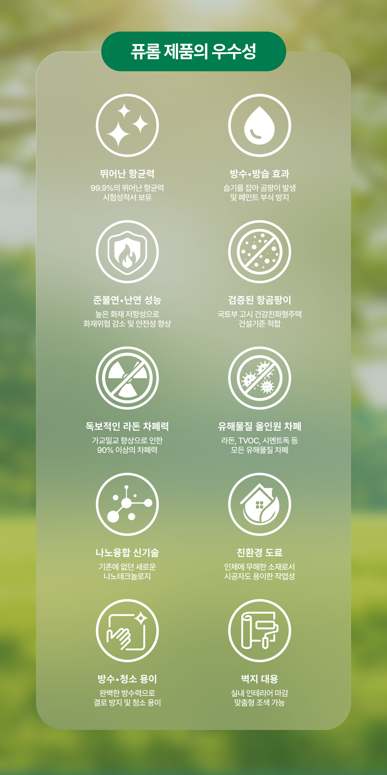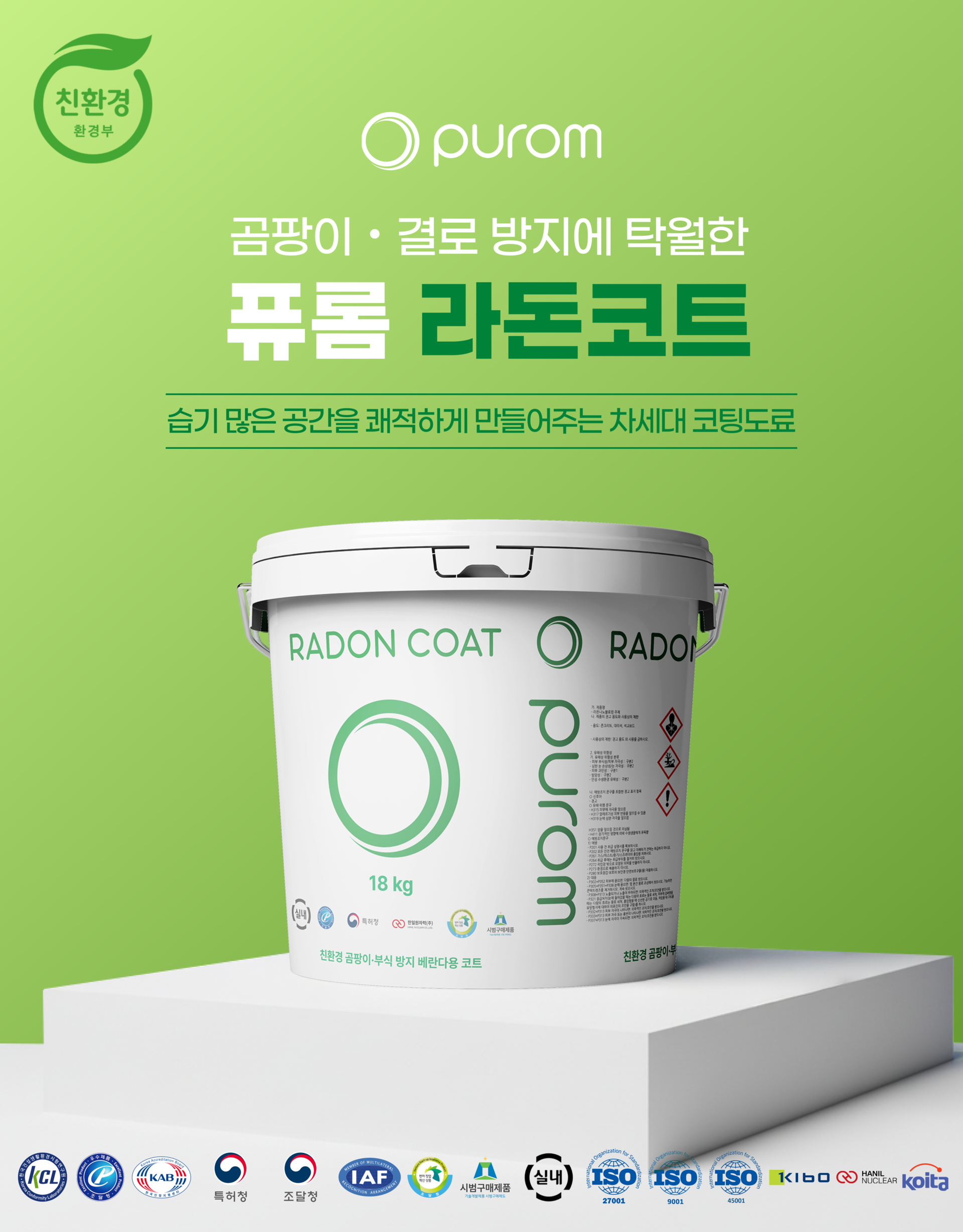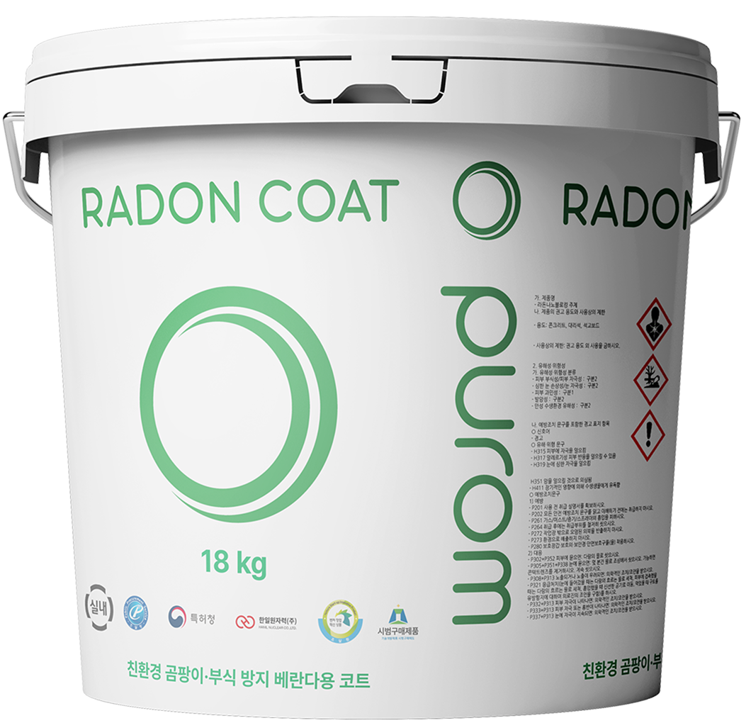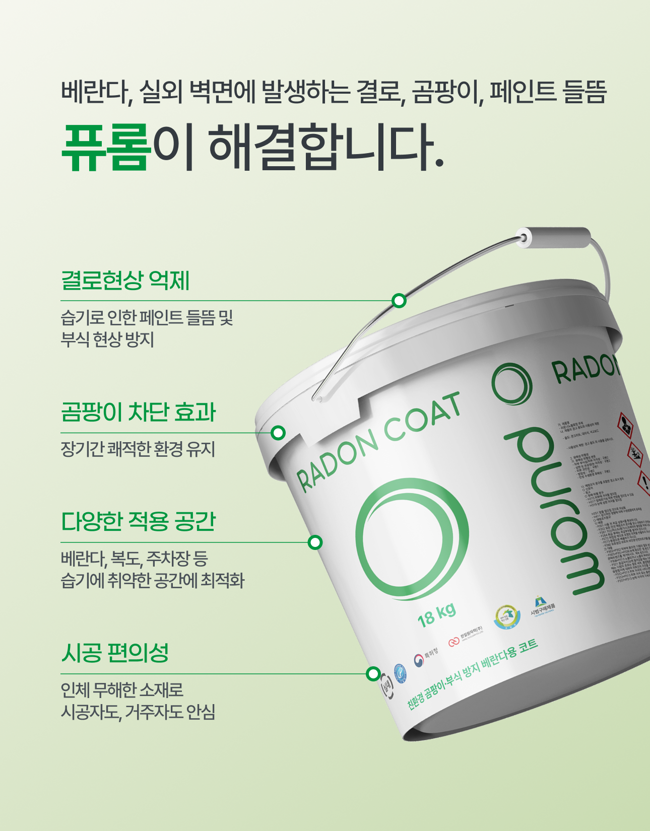 퓨롬 라돈코트는 습기가 많은 공간을 쾌적하게 만들어 주는 코팅도료입니다.베란다, 주차장 및 복도 같은 실외 벽면에 발생하는 페인트 들뜸 현상을 방지합니다.